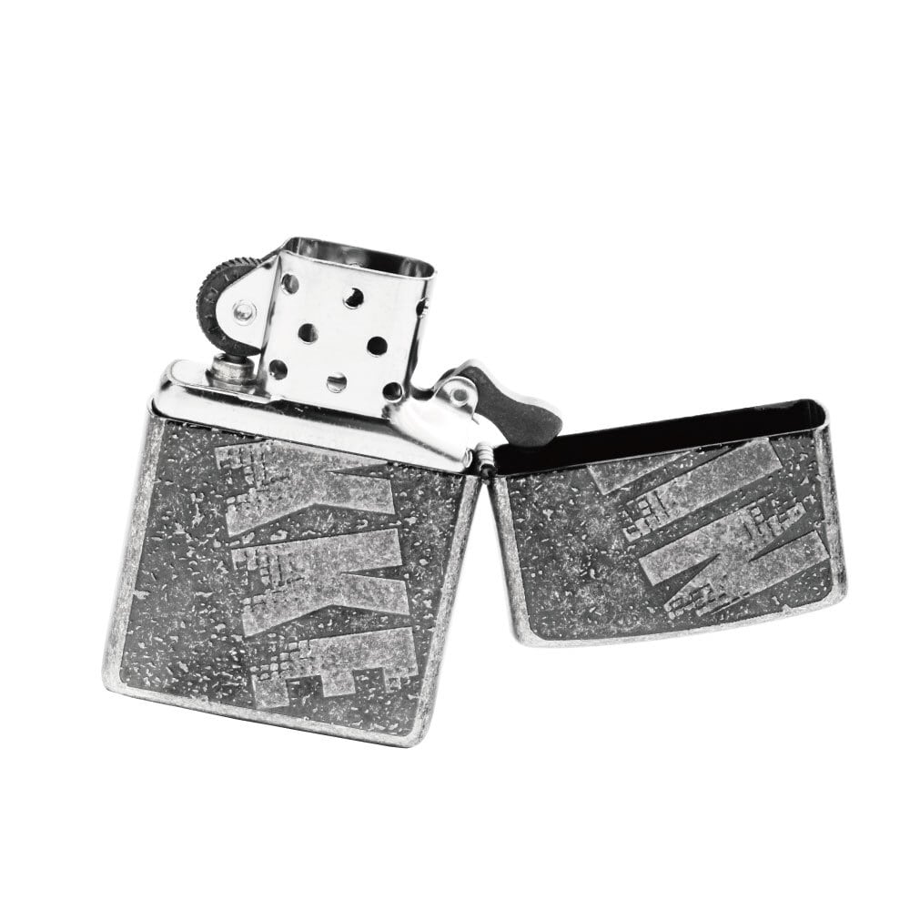 シルバーのボディーに企業ロゴが施された、シンプルながらグランジ感のあるデザインのZIPPOライター。