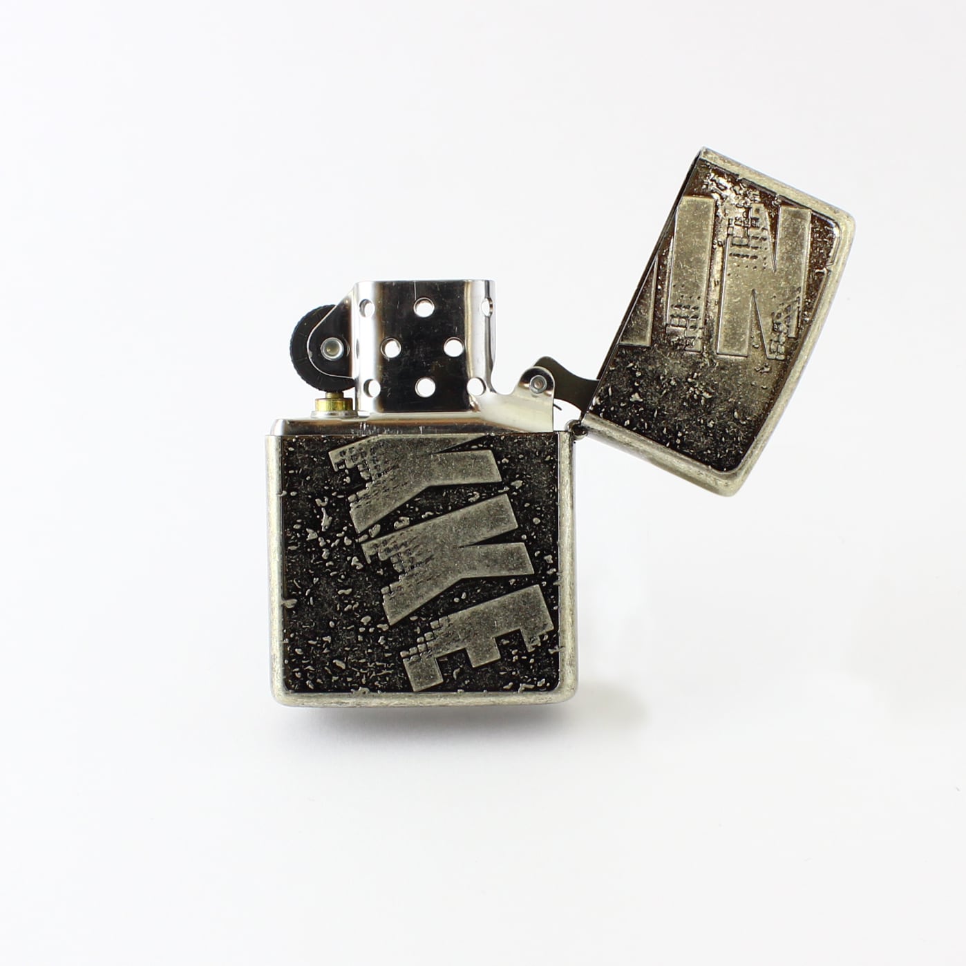 シルバーのボディーに企業ロゴが施された、シンプルながらグランジ感のあるデザインのZIPPOライター。